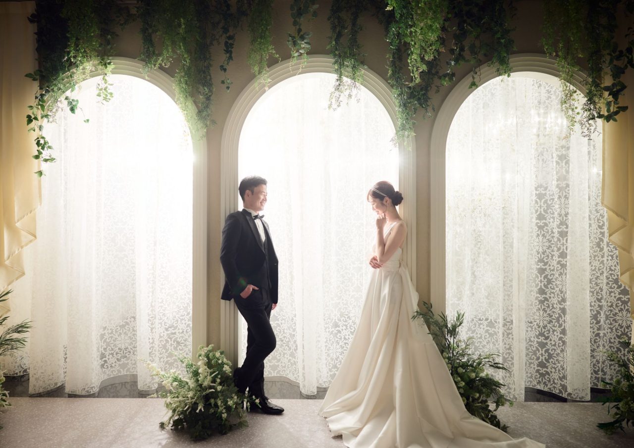 韓国スタジオで、シャンデリアやフラワーウォールなど